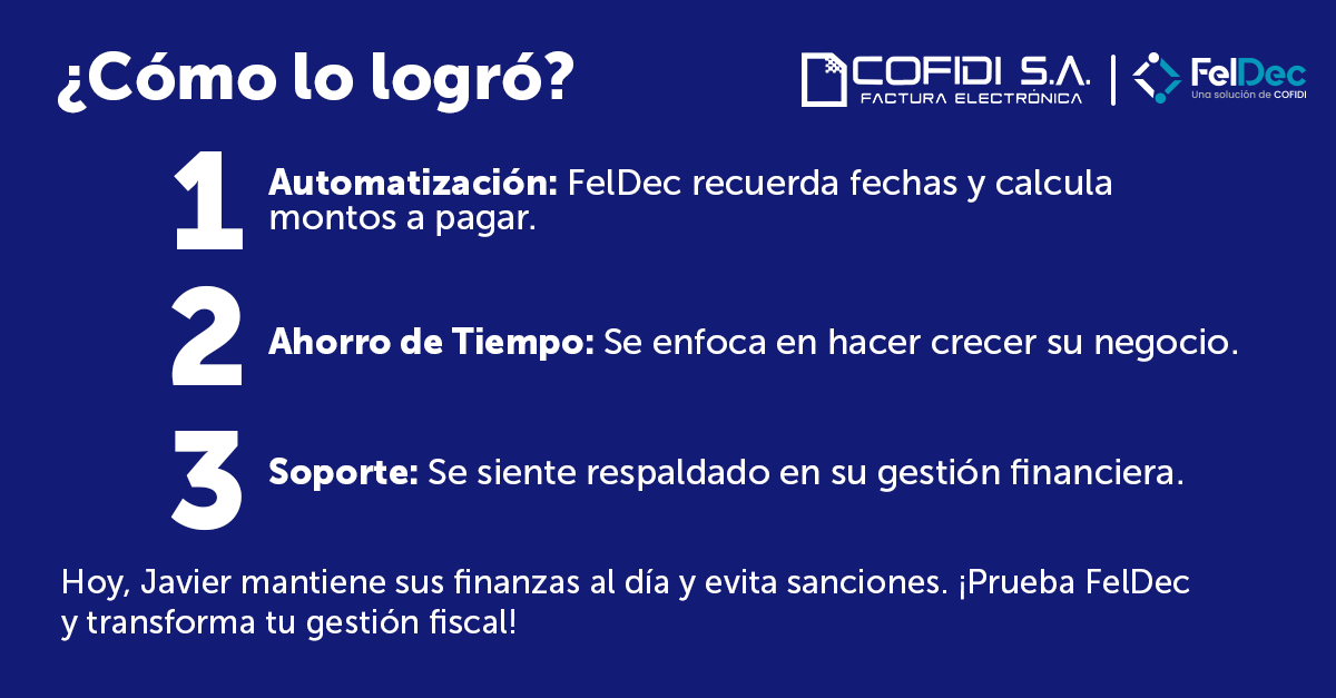 Sin embargo, todo cambió cuando Javier descubrió FelDec, una solución que le permitió automatizar y simplificar sus responsabilidades fiscales, dándole más tiempo para enfocarse en hacer crecer su negocio.